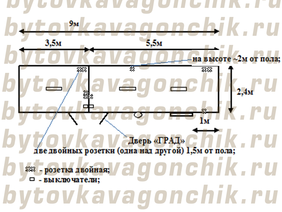 - электрика в кабель-канале: 3-х жильный провод (розетки – 3*4; освещение – 3*1,5) светильник-3шт., светильник уличный-1шт., выключатель-3шт., розетка двойная -4шт., розетка – 3шт.; автомат на розетки (40 А) – 2шт., автомат на освещение (10 А) – 2шт.